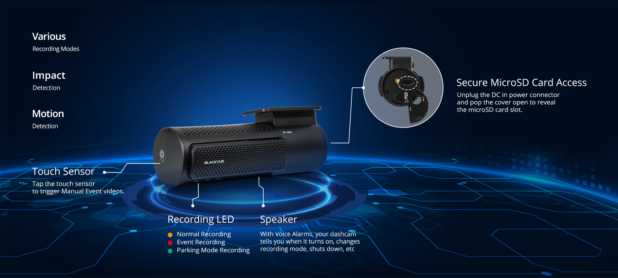 | LED Indicators | Front: Recording LED, GPS LED, B/W/L (Bluetooth/Wi-Fi/LTE) LED, Front Security LED Rear: Rear Security LED |